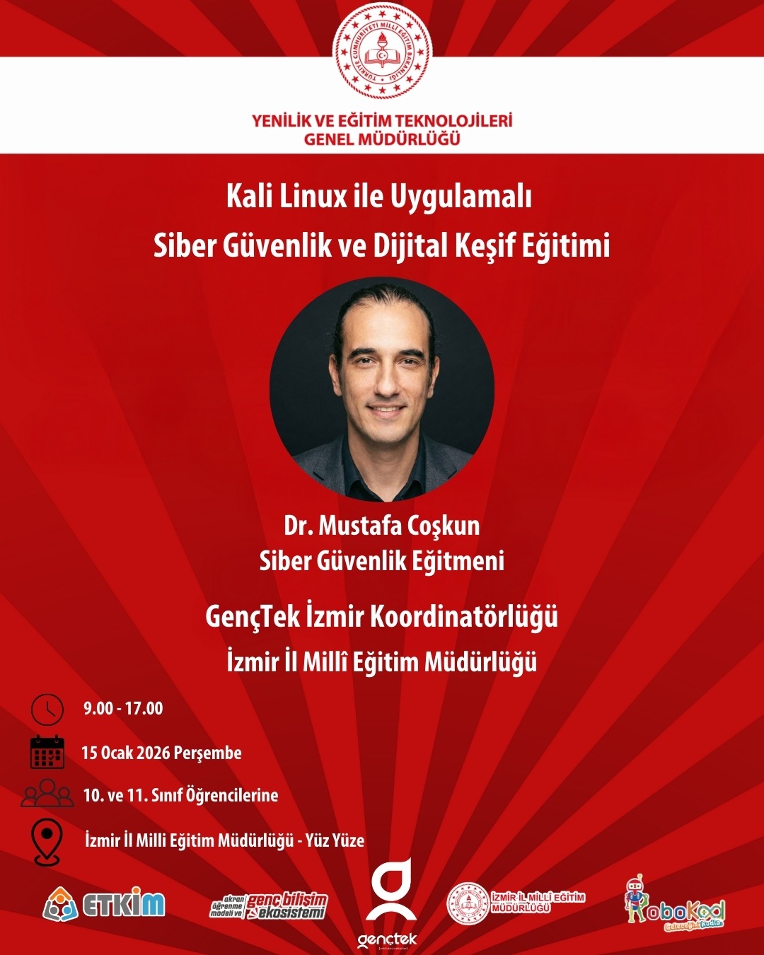Genç Bilişim Ekosistemi ve Akran Öğrenme Modelinin geliştirilmesi hedefleri doğrultusunda Genel Müdürlüğümüz koordinasyonunda yürütülen GençTek çalışmaları kapsamında İzmir İl Millî Eğitim Müdürlüğü YEĞİTEK Şubesi tarafından “Kali Linux ile Uygulamalı Siber Güvenlik ve Dijital Keşif Eğitimi” 15 Ocak 2026 Perşembe günü gerçekleştirildi.GençTek İzmir bünyesinde kurulması planlanan Siber Güvenlik Çalışma Grubu tarafından düzenlenen eğitimle; İzmir’in genç “Siber Dedektifleri” ilk adımlarını attı.