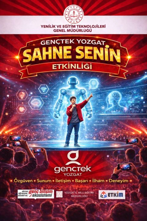 Genç Bilişim Ekosistemi ve Akran Öğrenme Modelinin geliştirilmesi hedefleri doğrultusunda Genel Müdürlüğümüz koordinasyonunda yürütülen GençTek çalışmaları kapsamında Yozgat İl Millî Eğitim Müdürlüğü GençTek Yozgat Koordinatörlüğünce " Sahne Senin" Etkinliği, 13 Şubat 2026 Cuma günü Yozgat Şehitler Fen Lisesi ev sahipliğinde gerçekleştirildi. Etkinliğin açılışı, GençTek Yozgat İl Koordinatörü tarafından yapılan sunum ile başladı. Programda, gençlerin geliştirdikleri projelerin arka planını, üretim süreçlerini, karşılaştıkları zorlukları ve elde ettikleri deneyimleri doğrudan kendi anlatımlarıyla paylaşmalarına imkân sağlandı. Öğrencilerin sahneye çıkarak proje yolculuklarını anlatmaları, akran öğrenmesini destekleyen ve ilham veren bir öğrenme ortamı oluşturdu.Etkinliğe; Yozgat YEĞİTEK İl