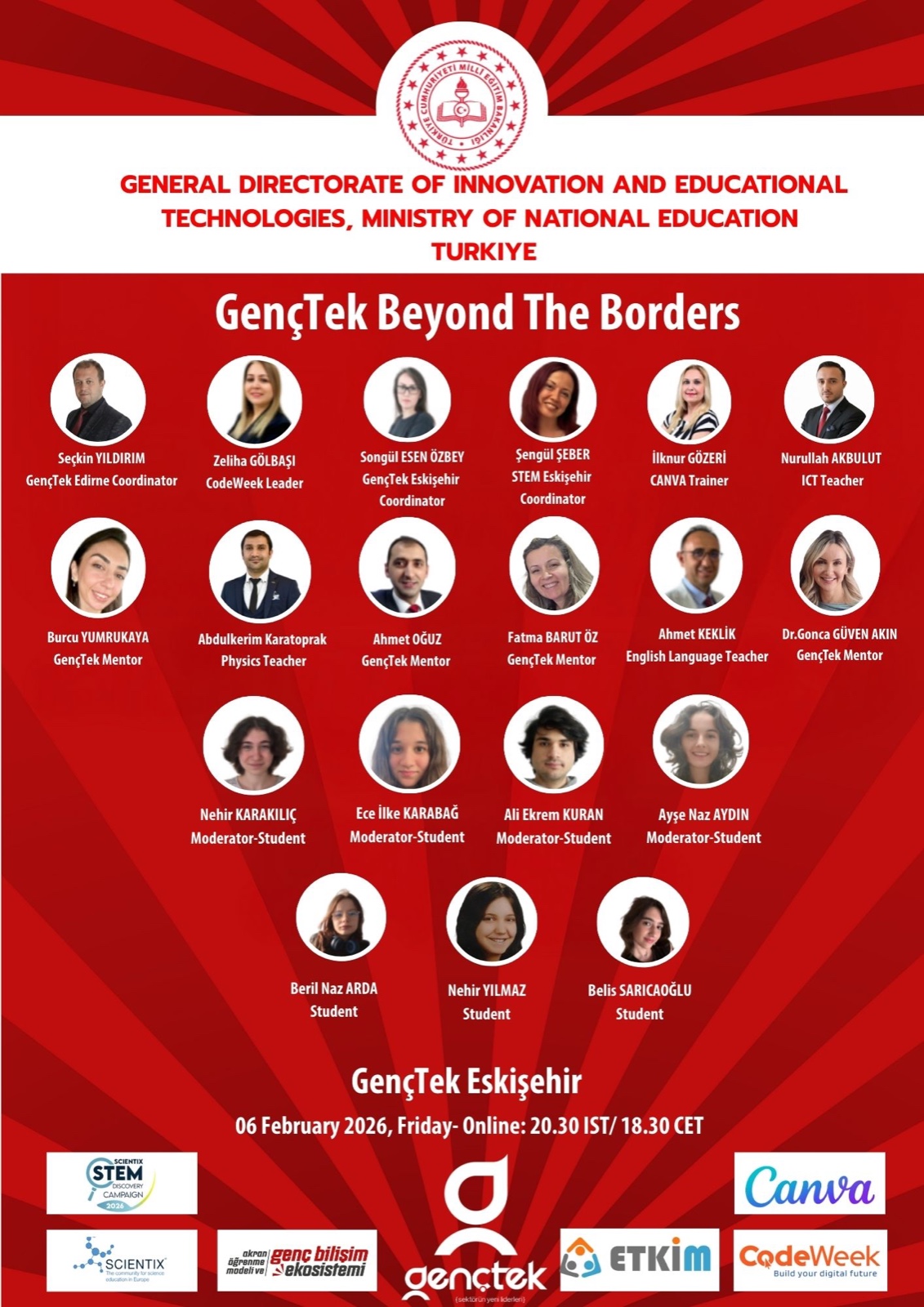 Genç Bilişim Ekosistemi ve Akran Öğrenme Modelinin geliştirilmesi hedefleri doğrultusunda Genel Müdürlüğümüz koordinasyonunda yürütülen GençTek çalışmaları kapsamında Eskişehir İl Millî Eğitim Müdürlüğü YEĞİTEK Şubesi GençTek Koordinatörlüğü öncülüğünde, Edirne İl Millî Eğitim Müdürlüğü YEGITEK Şubesi STEM ve GençTek Koordinatörlüğü ile Kayseri İl Millî Eğitim Müdürlüğü YEGITEK Şubesi STEM Koordinatörlüğünün iş birliğiyle düzenlenen GençTek Beyond the Borders etkinliği kapsamında, GençTek öğrencileri sınır ötesindeki ülkelerde öğrenim gören akranlarıyla çevrim içi ortamda bir araya geldi. 6 GençTek öğrencisinin moderatörlüğünde , 9–10 kişilik çevrim içi etkileşim odalarında (breakout rooms) gerçekleştirilen etkinlikte üç etkileşimli eşleşme yapıldı. Her biri yaklaşık 15 dakika süren bu oturumlarda,