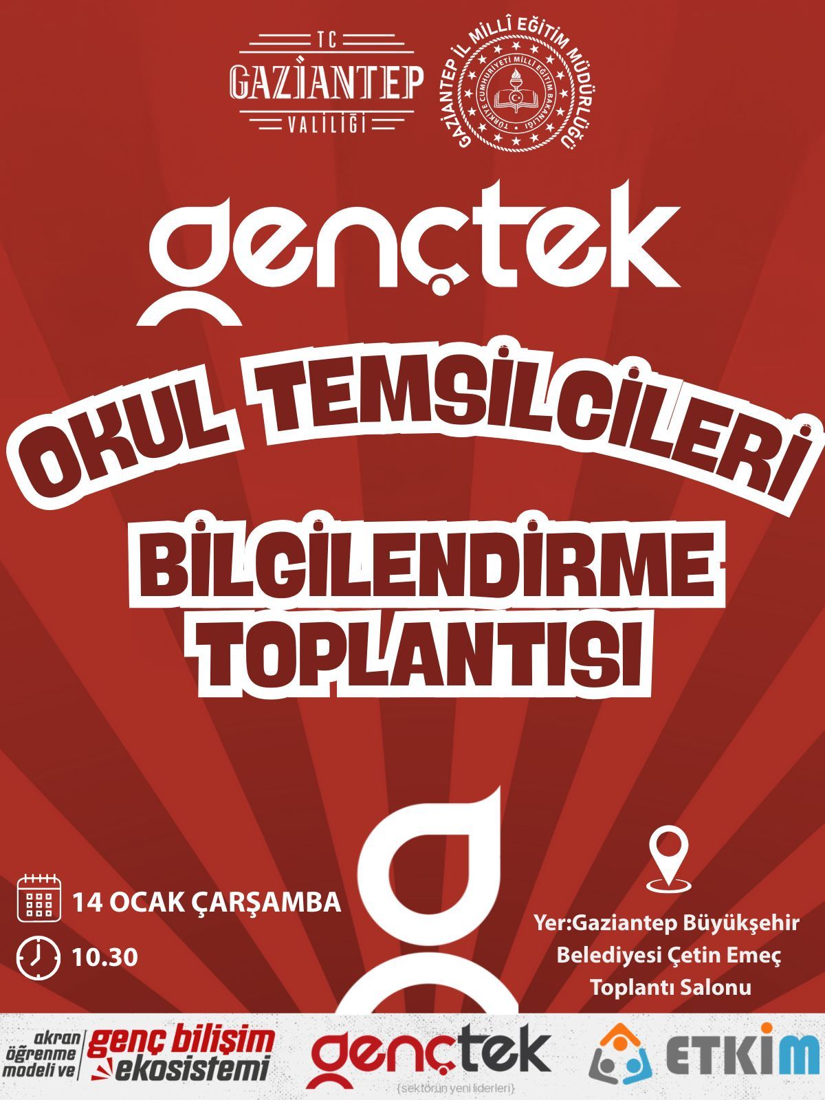 Genç Bilişim Ekosistemi ve Akran Öğrenme Modelinin geliştirilmesi hedefleri doğrultusunda Genel Müdürlüğümüz koordinasyonunda yürütülen GençTek çalışmaları kapsamında Gaziantep ilimizde danışman öğretmenlerimiz ve okul temsilcisi öğrencilerimizin katılımıyla " GençTek’le Geleceği Sen Tasarla!" temalı Okul Temsilcileri Bilgilendirme Toplantısı, 14 Ocak 2026 Çarşamba günü Gaziantep Büyükşehir Belediyesi Çetin Emeç Toplantı Salonu'nda gerçekleştirildi. Toplantıda gençlerin birbirinden öğrenerek güçlendiği, fikirlerin gerçek projelere dönüştüğü GençTek ekosistemi tanıtıldı. Bu yolculukta gençlerin sadece takip eden değil; üreten, geliştiren ve geleceğe yön veren bireyler olması hedefleniyor.Toplantı, katılımcıların soruları ve karşılıklı fikir alışverişiyle verimli bir şekilde tamamlandı.