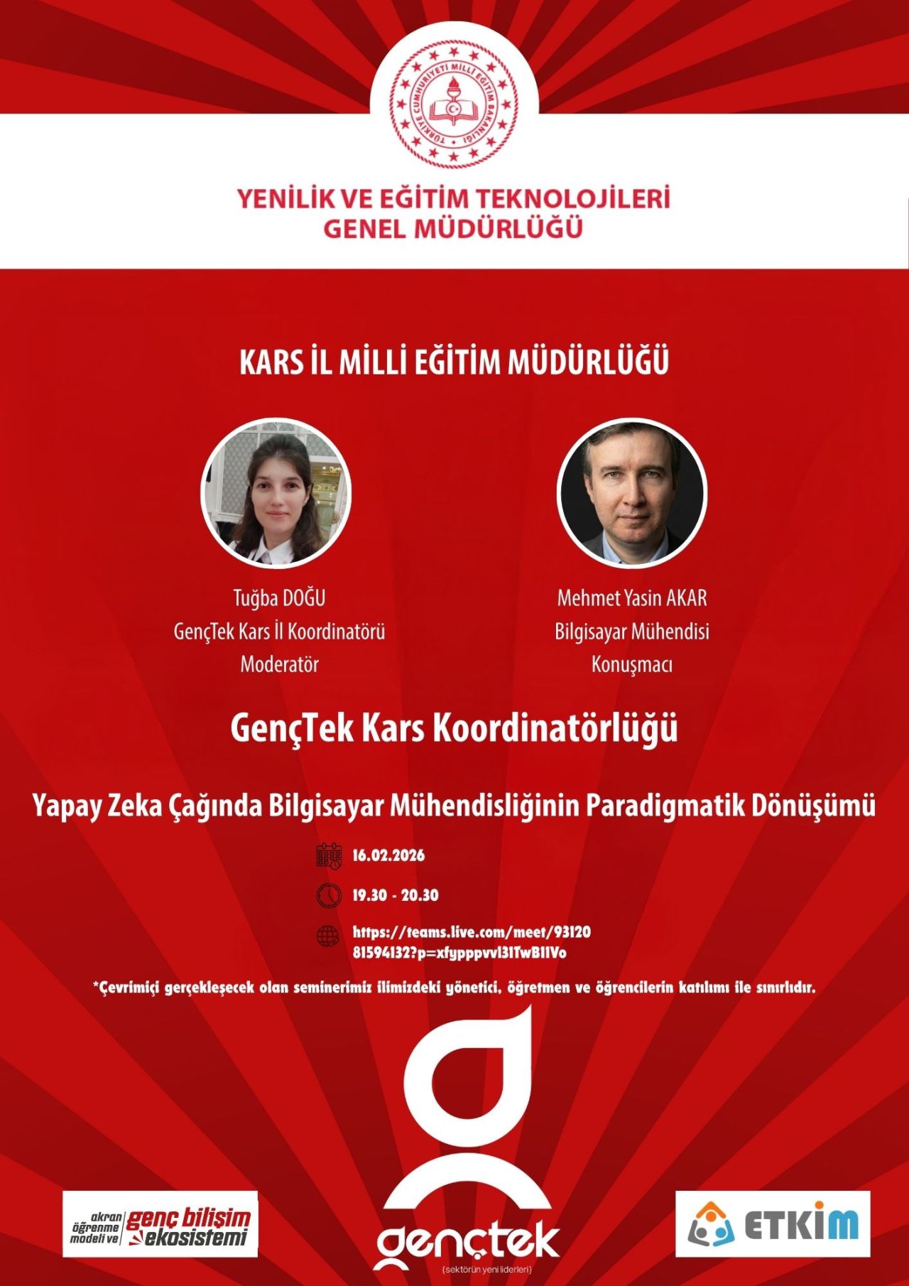 Genç Bilişim Ekosistemi ve Akran Öğrenme Modelinin geliştirilmesi hedefleri doğrultusunda Genel Müdürlüğümüz koordinasyonunda yürütülen GençTek çalışmaları kapsamında Kars İl Millî Eğitim Müdürlüğü YEĞİTEK Şubesi GençTek Koordinatörlüğünce “Yapay Zekâ Çağında Bilgisayar Mühendisliğinin Paradigmatik Dönüşümü” başlıklı çevrim içi seminer, 16.02.2026 Pazartesi günü 12 lise öğrencisinin katılımıyla gerçekleştirilmiştir.